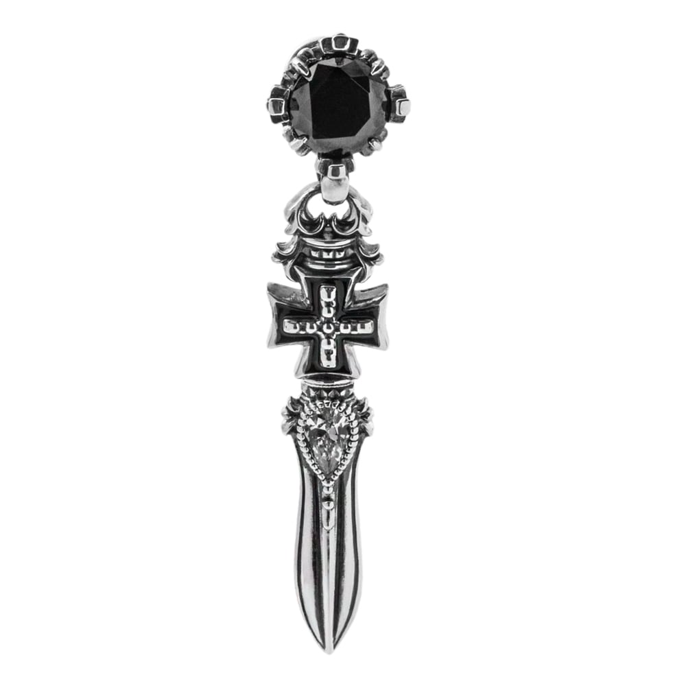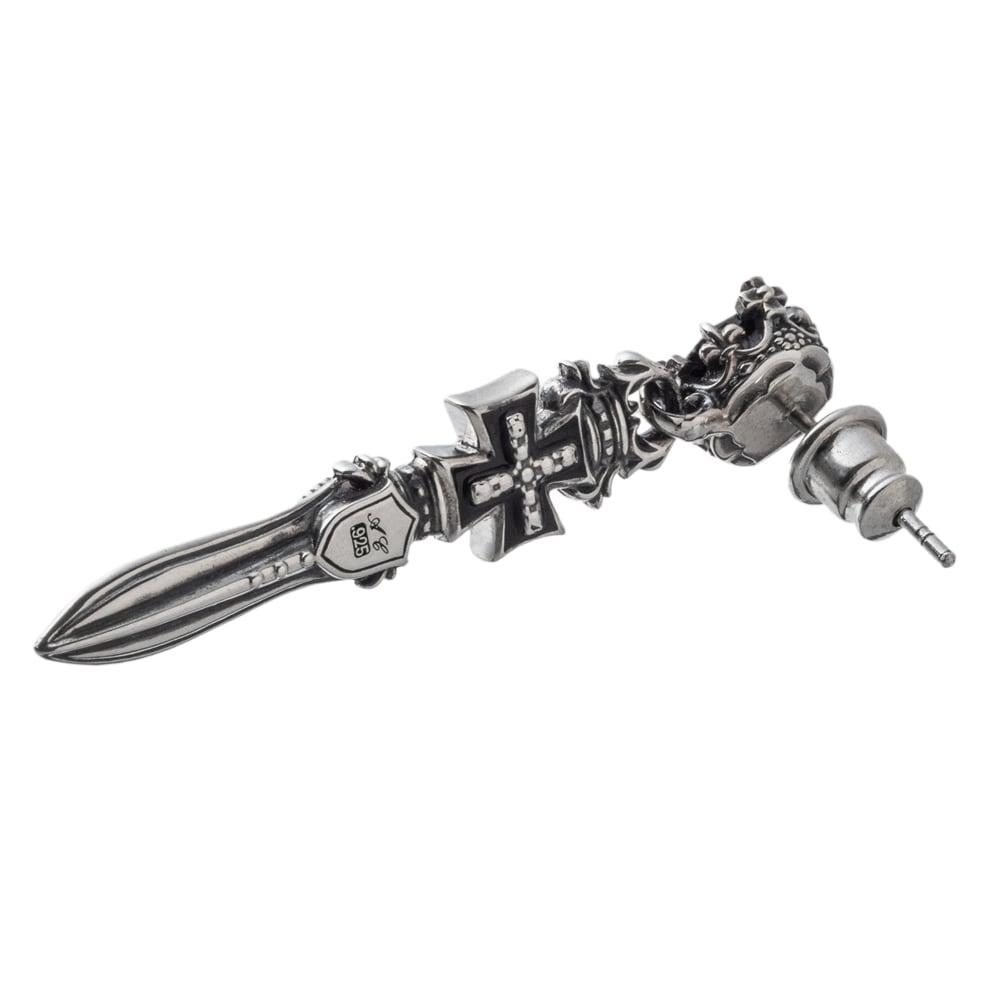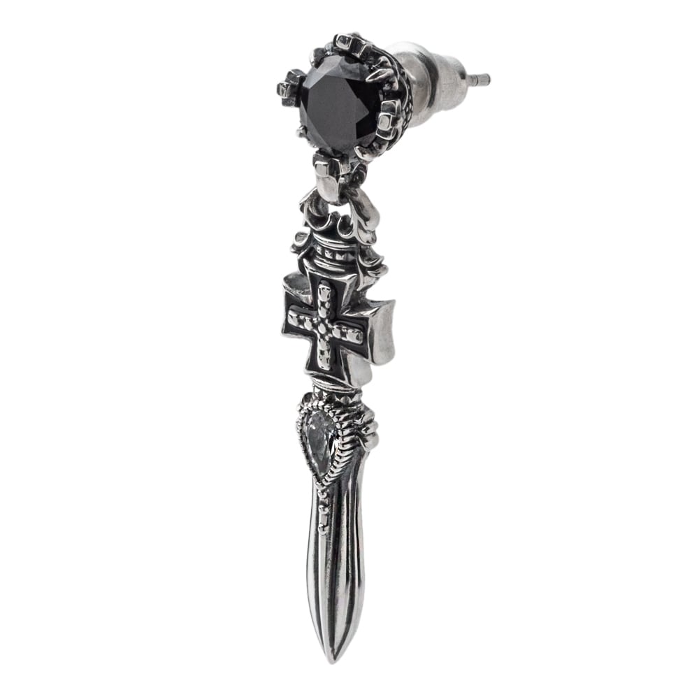 王冠、クロス、ソードとモチーフが連なるピアス。石は白黒のキュービック。クロスは黒のエナメル。エッジの利いた剣のデザインピアス。剣は勇敢さや正義のシンボルモチーフ。細部まで作り込まれたデザイン。