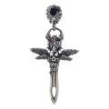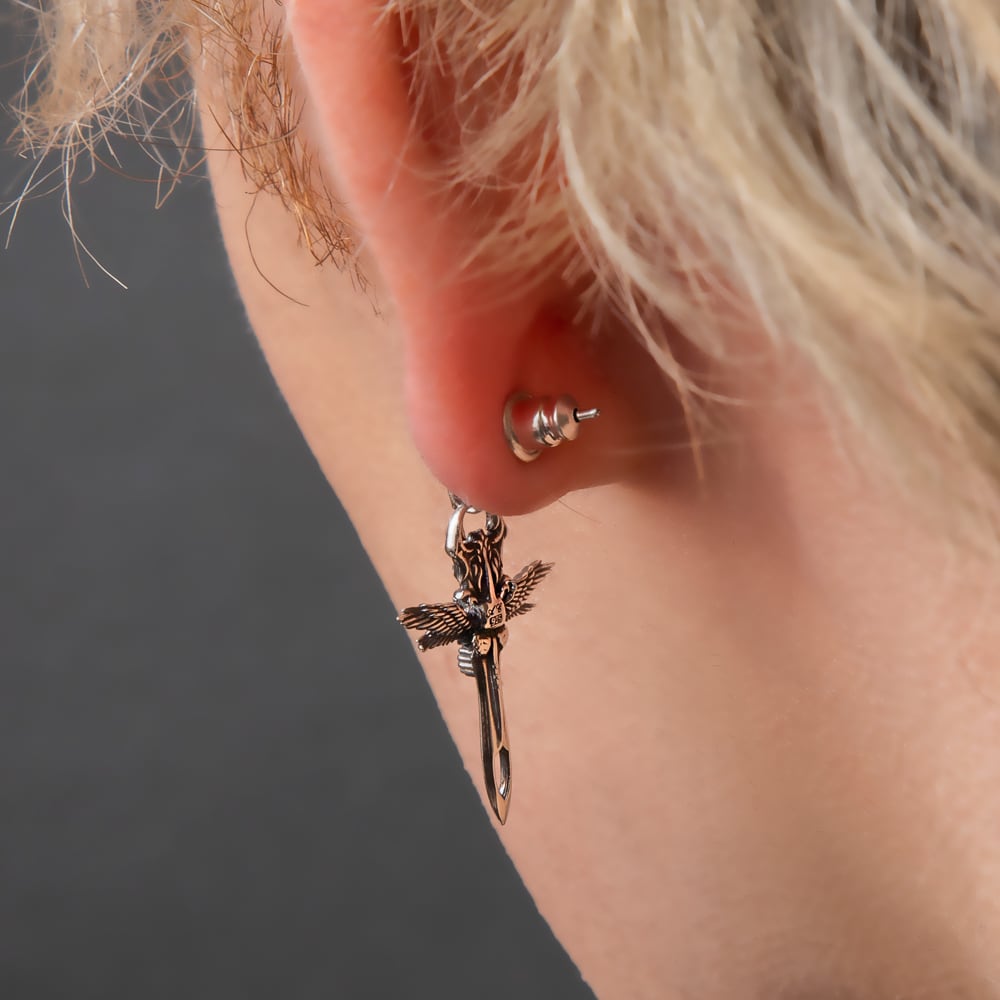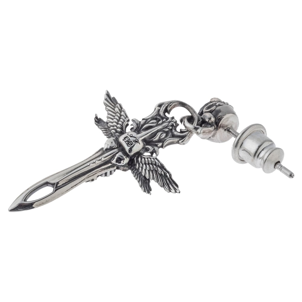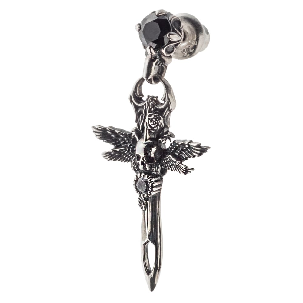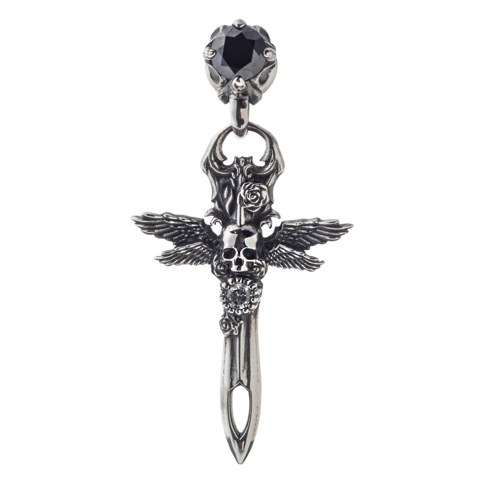 羽ばたく4つの翼とスカルから連なる剣モチーフのピアス。黒い石はブラックジルコニア。薔薇も散りばめられた細部まで作り込まれたデザイン。剣は勇敢さや正義のシンボルモチーフ。同デザインのペンダントを合わせてコーディネートもおススメ。