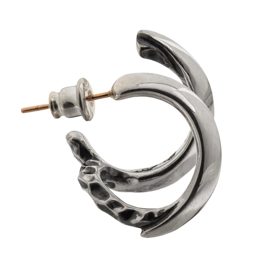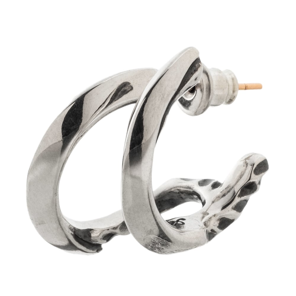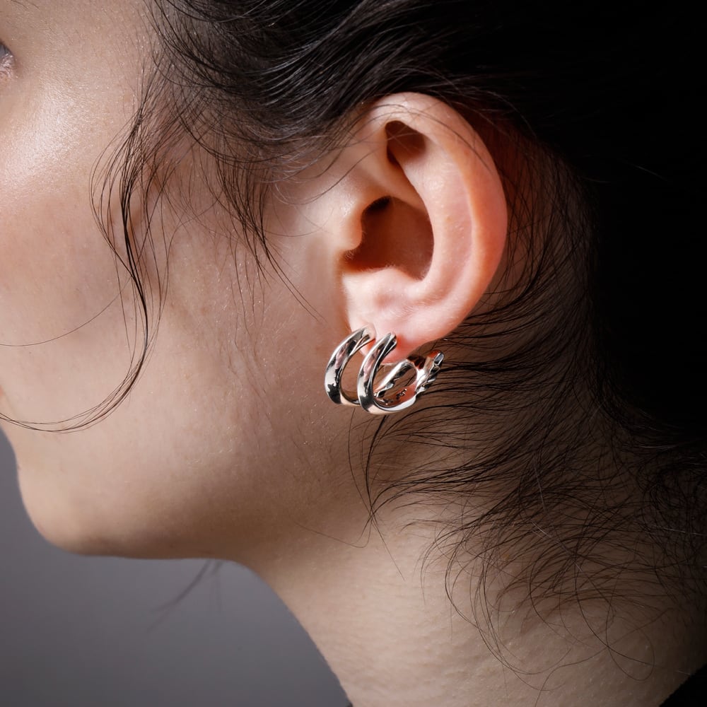 2連フープに見えるギミック式フープピアス。フープが後ろ部分で繋がっている立体的デザイン。シンプルで、つるっとした表面の加工が、ワンランク上の質感を演出。どんな装いにもしっくりと馴染む、万能なデザインです。シルバーの上品な艶が引き立つプレーンなデザインが、洗練された雰囲気を演出します。アルテミスらしいクールなシルエットが魅力。