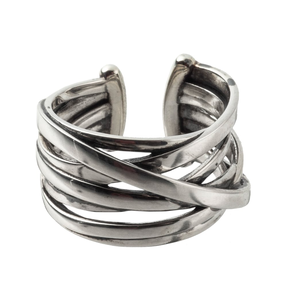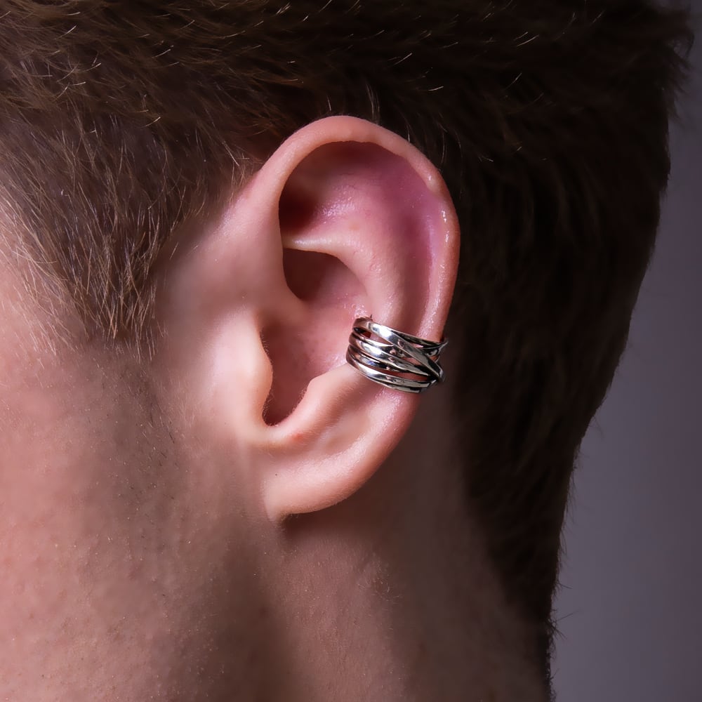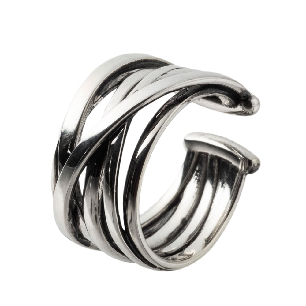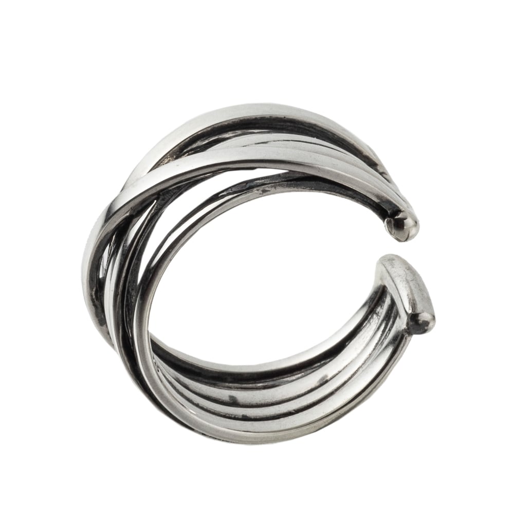 幾重にもリングが重なり合ったようなデザインのイヤーカフ。程よいボリューム感あるデザインが耳元をオシャレに魅せてくれます。光沢ある銀の質感を生かし、きらめきを堪能出来る逸品です。派手すぎないシンプルフォルム。