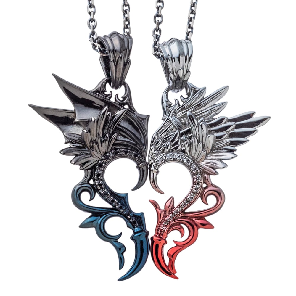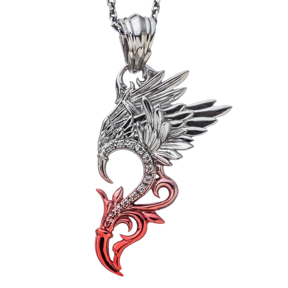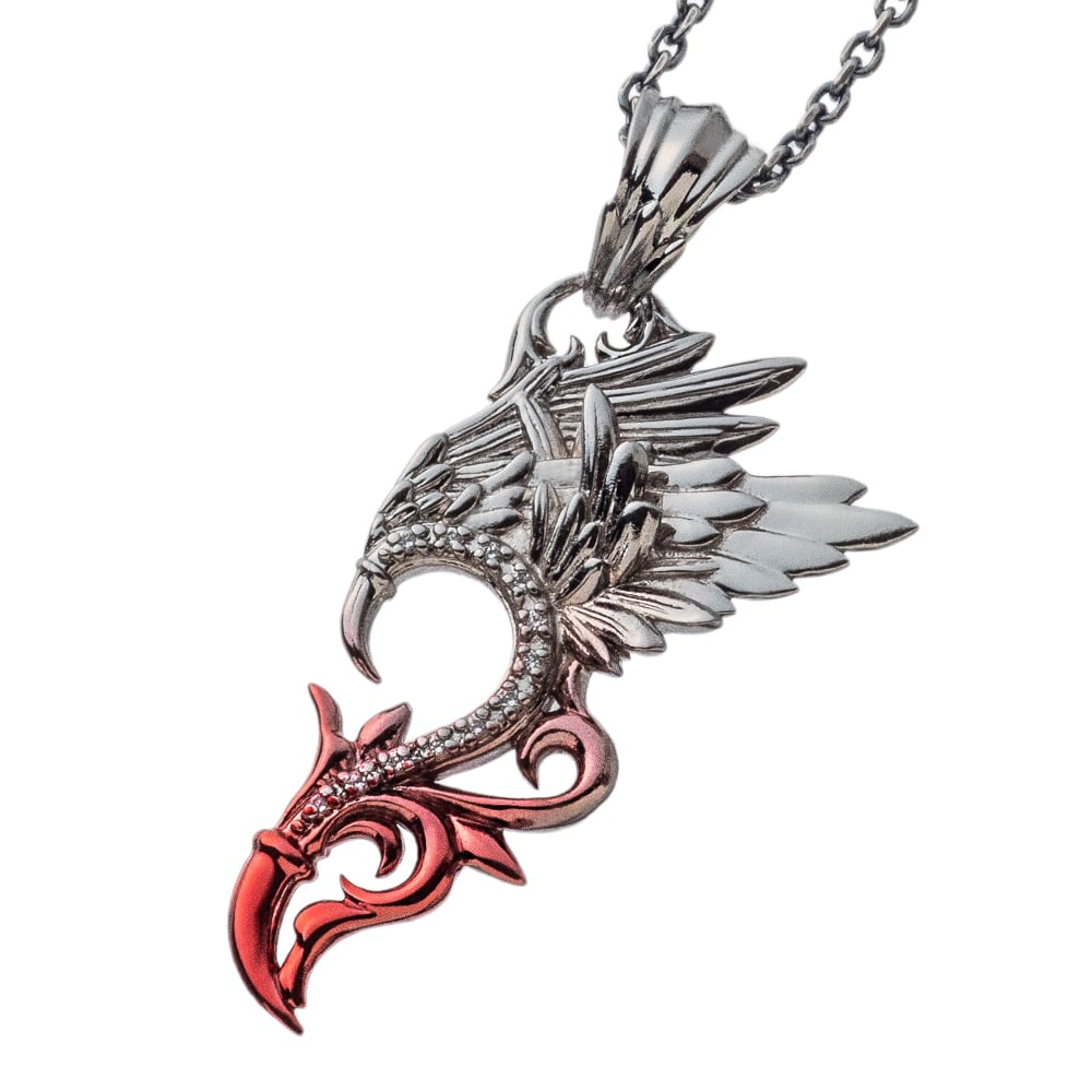 エンジェルとデビルを合わせるとハート型になるペアものペンダント。ロジウムメッキに赤のプレシード加工を施しグラデーションをかけた配色。石はCZクリアーをパヴェセッティング。天使の翼をイメージした躍動感溢れるペンダント。羽根には飛躍・上昇の意味があり、お守りや願掛けのアイテムとしてもオススメ。程よいサイズ感で着け心地良好。裏にはブランドと925の品質刻印。