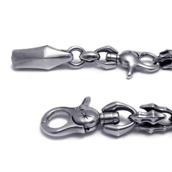 芸術的ともいえる柔和に光を反射させるパーツの連結。コーディネートに巨大なインパクトを作り出す秀逸のアイテム。
