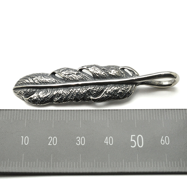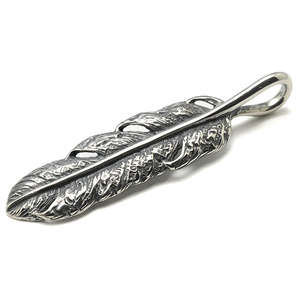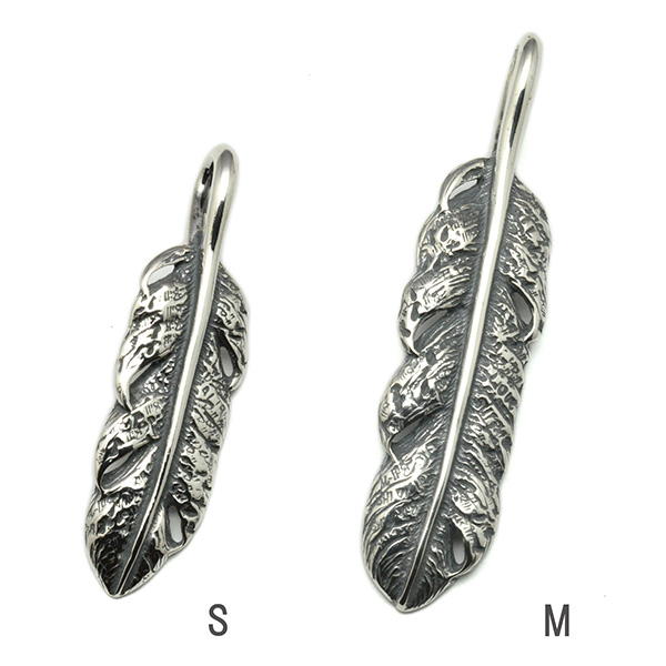 フェザーモチーフに無数のスタンプが打ち込まれたグラフィティ―フェザーペンダント。サイズはS,M,Lの3種類展開です。Sサイズとの重ね付けもオススメです。