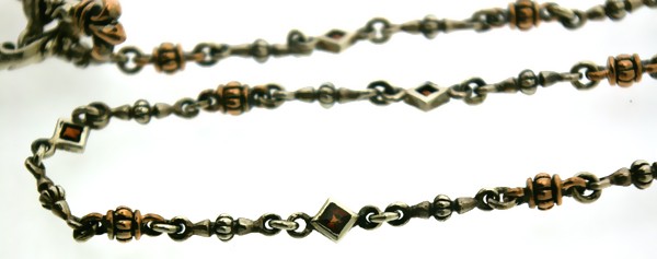 ロイヤルシルバーとスクェアガーネットのコンビのデザインチェーンが、通常のアイテムでは出せないゴージャスで気品のあるネックレスに仕上げています。