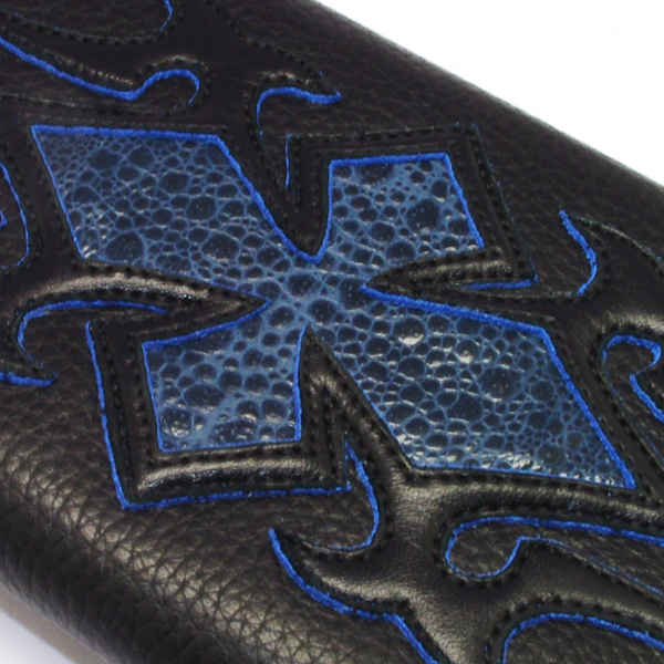 今でこそシルバーでも有名なトラヴィスですが、もとは革の魔術師の異名を持つ程のレザー職人。 デザイナー本人も自身の作品に自負する程、レザーに強いこだわりがあるようです。 すべてのレザーを手作りと一貫しており、ユーザーの要望を聞いてスペシャルオーダーも受け付けてくれる。 こちらのウォレットは一番人気のレザーアートをブルーで製作してもらいました。